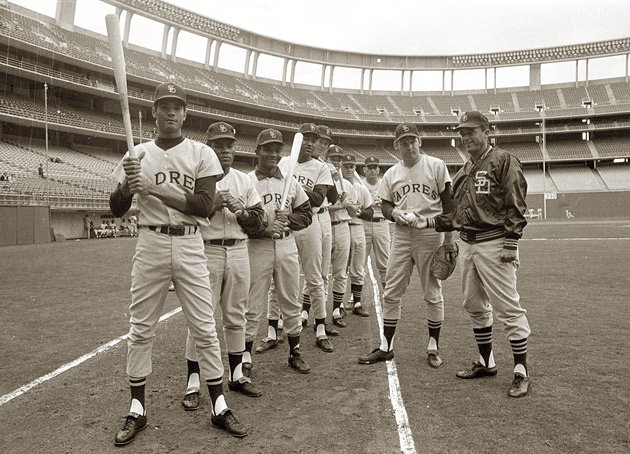Here’s the who’s featured in the photo (L to R): Rafael Robles, Roberto Pena, Tony Gonzalez, Ollie Brown, Bill Davis, Larry Stahl, Ed Spiezio, Chris Cannizzaro, and starting pitcher Dick Selma and manager Preston Gomez to the right. (Photo Source: The San Diego Union Tribune)