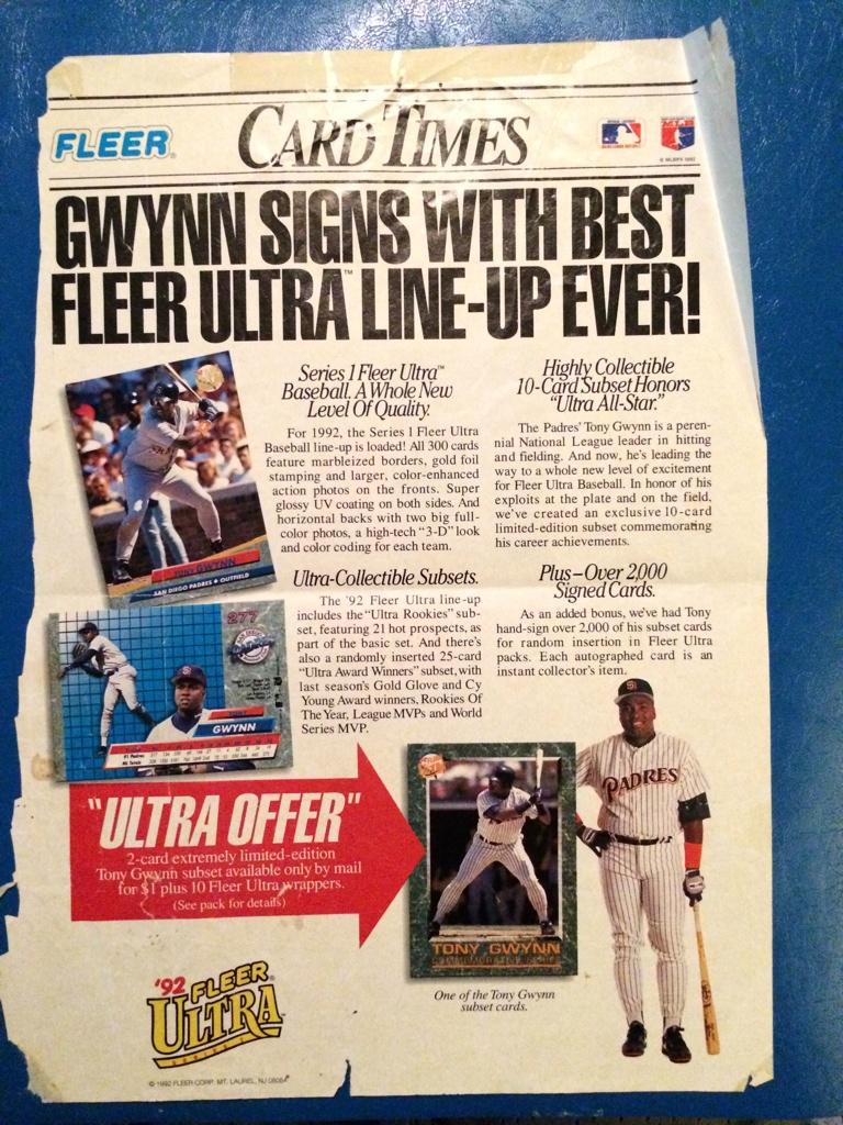 When I was a kid my walls were covered with images of professional athletes, and many of those images were of Tony Gwynn. This Fleer baseball card advertisement from 1992, featuring Mr. Padre himself was on my wall for years. For some reason, as I got older and my walls slowly became covered images of musicians and skateboarders, my Tony Gwynn stuff didn’t get thrown away, but packed away. I’m glad I made this decision.